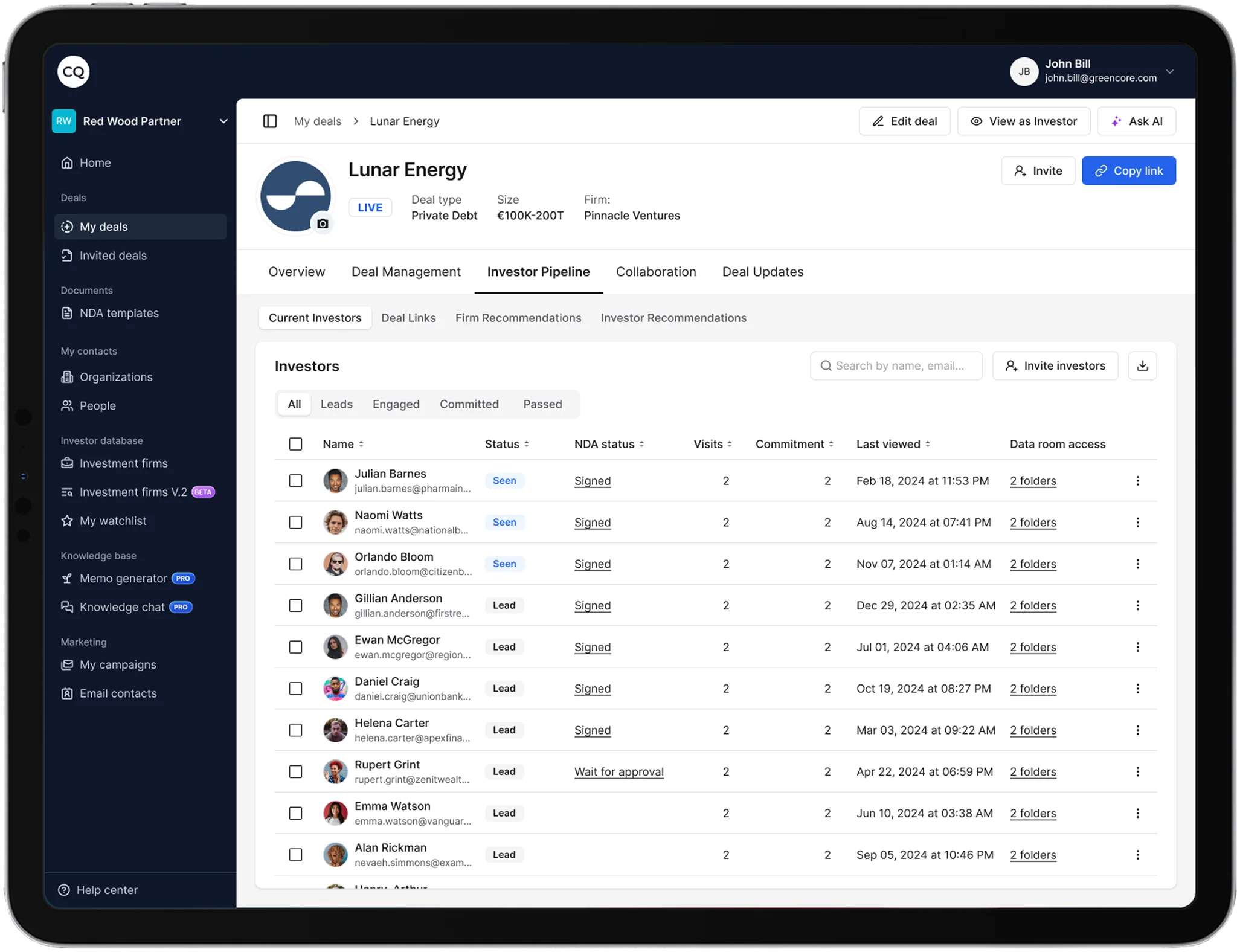 Investors see the NDA requirement and sign directly on CQ. Access unlocks automatically based on your settings.