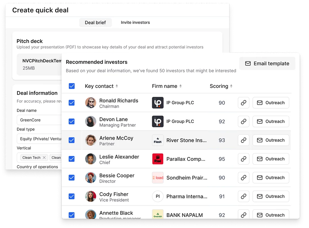 Create a deal, fill out your profile, and get ranked investor recommendations in under a minute. Our AI surfaces LPs from 150K+ profiles who actually fit your strategy.